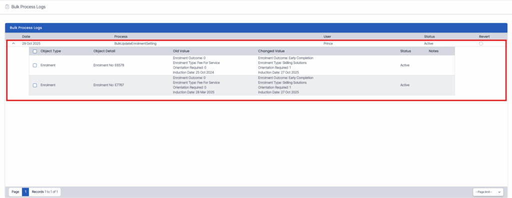 In addition to reverting changes from the Bulk Result Settings and Bulk AVETMISS Settings screens, you can now also roll back updates made in the Enrolment Settings pop-up(option in the burger menu of Listing screen).