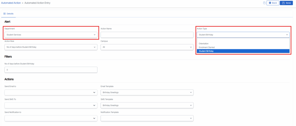 With this addition, you can now set up automated birthday notifications to celebrate students on their special day. After selecting the Student Birthday action type, define the Action Rule and Campus, and based on your selection, additional filters will appear to refine your conditions.